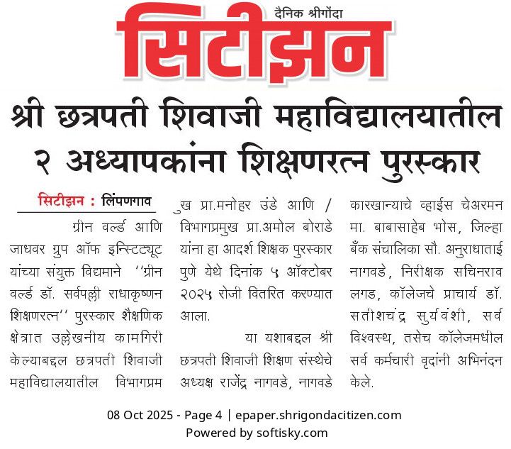 श्री छत्रपती शिवाजी महाविद्यालयातील २ अध्यापकांना शिक्षणरत्न पुरस्कार.