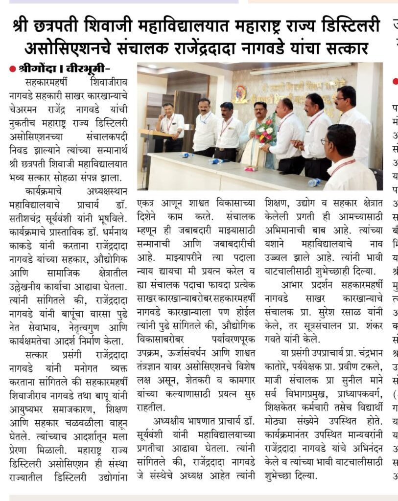 श्री छत्रपती शिवाजी महाविद्यालयात महाराष्ट्र राज्य डिस्टीलरी असोसिएशनचे संचालक राजेंद्रदादा नागवडे यांचा सत्कार